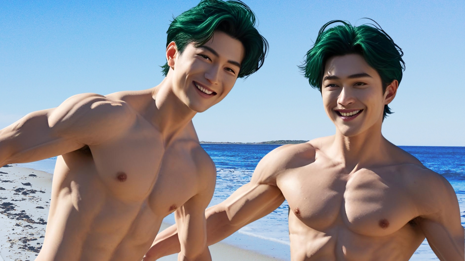 背景はCanva備え付けの海岸画像を使い、人物像はCanvaAIにて出力後背景透過処理を加えて位置調整しました。