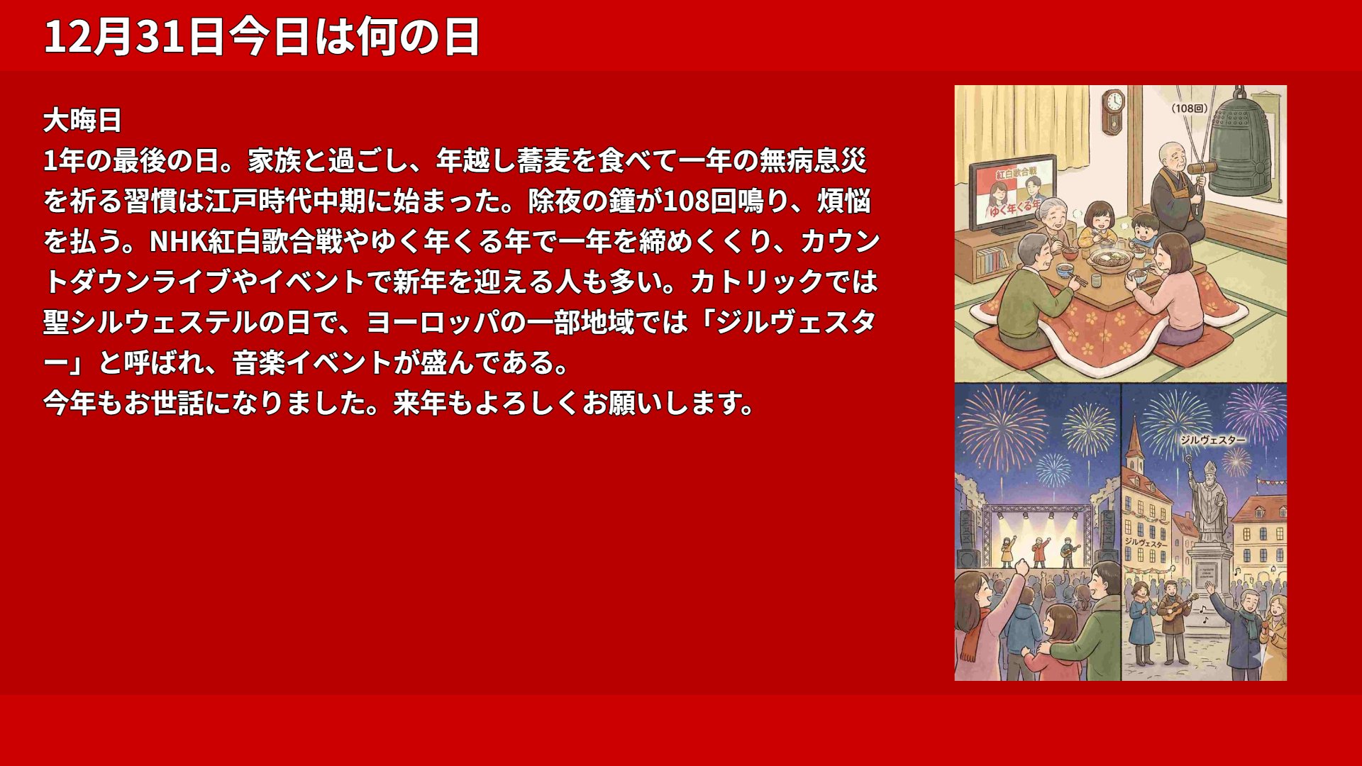 1年の最後の日。家族と過ごし、年越し蕎麦を食べて一年の無病息災を祈る習慣は江戸時代中期に始まった。除夜の鐘が108回鳴り、煩悩を払う。NHK紅白歌合戦やゆく年くる年で一年を締めくくり、カウントダウンライブやイベントで新年を迎える人も多い。カトリックでは聖シルウェステルの日で、ヨーロッパの一部地域では「ジルヴェスター」と呼ばれ、音楽イベントが盛んである。