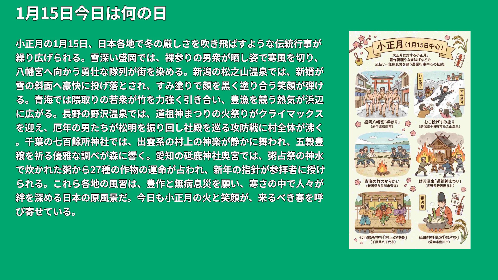 小正月の1月15日、日本各地で冬の厳しさを吹き飛ばすような伝統行事が繰り広げられる。雪深い盛岡では、裸参りの男衆が晒し姿で寒風を切り、八幡宮へ向かう勇壮な隊列が街を染める。新潟の松之山温泉では、新婿が雪の斜面へ豪快に投げ落とされ、すみ塗りで顔を黒く塗り合う笑顔が弾ける。青海では隈取りの若衆が竹を力強く引き合い、豊漁を競う熱気が浜辺に広がる。長野の野沢温泉では、道祖神まつりの火祭りがクライマックスを迎え、厄年の男たちが松明を振り回し社殿を巡る攻防戦に村全体が沸く。千葉の七百餘所神社では、出雲系の村上の神楽が静かに舞われ、五穀豊穣を祈る優雅な調べが森に響く。愛知の砥鹿神社奥宮では、粥占祭の神水で炊かれた粥から27種の作物の運命が占われ、新年の指針が参拝者に授けられる。これら各地の風習は、豊作と無病息災を願い、寒さの中で人々が絆を深める日本の原風景だ。今日も小正月の火と笑顔が、来るべき春を呼び寄せている。